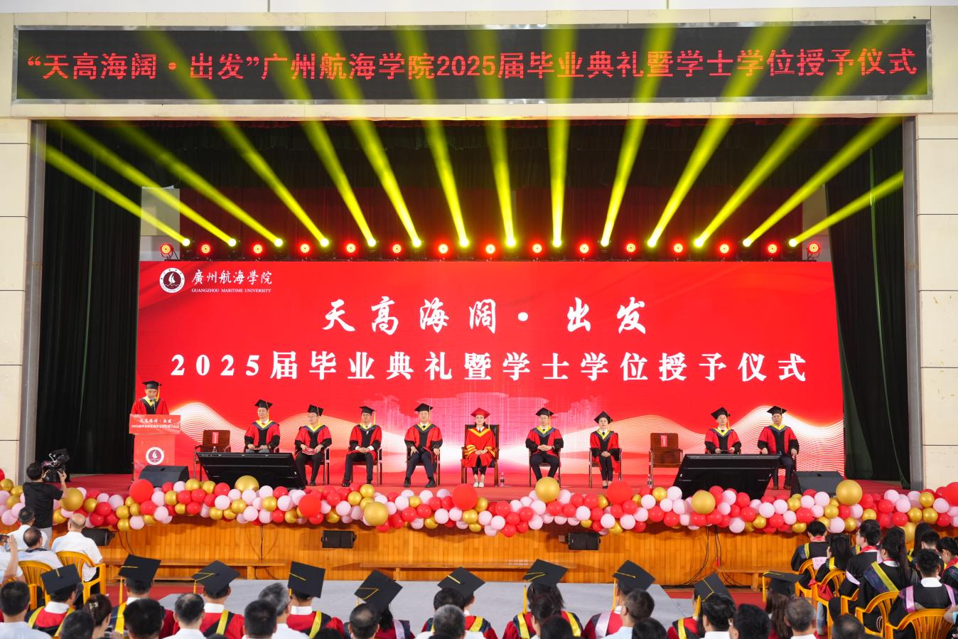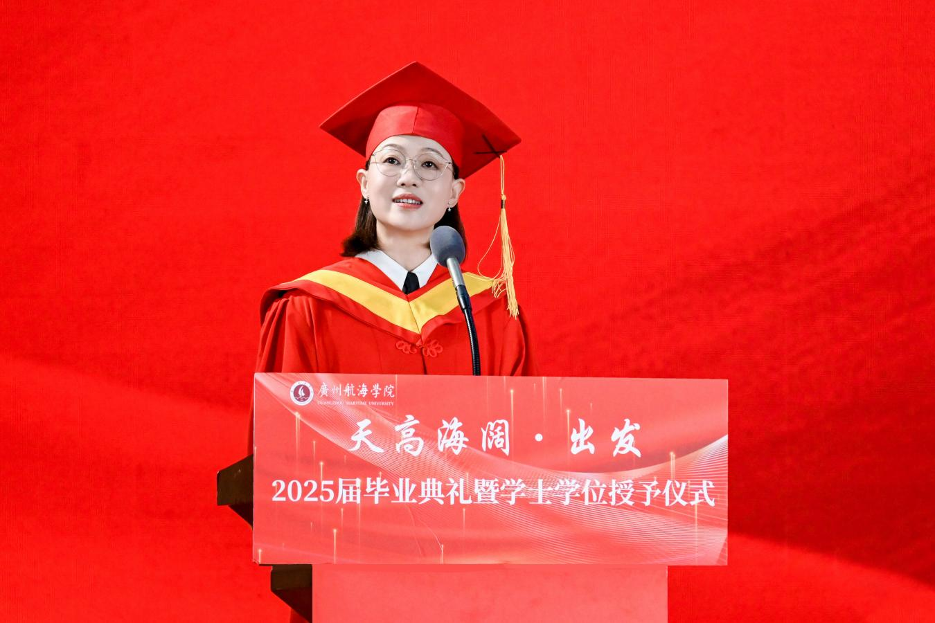 国歌声中,毕业典礼启幕。陶韶菁以《天高海阔凭君跃旗卷长空向沧溟》为题致辞。她回顾了2025届毕业生在母校4年的成长,细数同学们在军训场、教室里、实验室、图书馆、运动场留下的青春印记,指出同学们以勇气和坚持为青春做美好的诠释。她历数了学校4年来的跨越式发展。2021年,学校开启与芬兰等多个高等学府的中外合作办学;2022年,学校以优异成绩通过教育部本科教学合格评估;2023年,学校尹衍升教授等入选全球2%顶尖科学家榜单,开始在国际学术舞台展现广航智慧;2024年,学校全速前进,以建校60周年校庆为新起点谱写高质量发展新篇章;2025年,学校成为全国第14所、华南地区第一所交通强国建设试点高校,积极为交通强国、海洋强国、教育强国贡献广航智慧、广航力量。