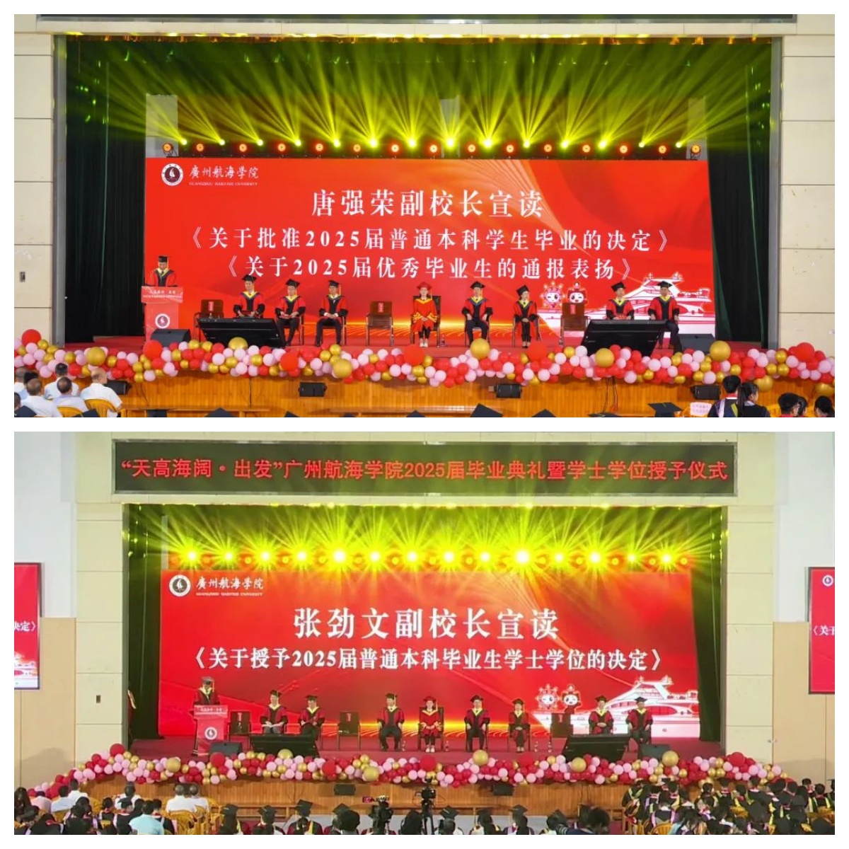 面向新征程,陶韶菁对毕业生提出四点期望:一是始终心怀寰宇家国情深。从援越抗美立功的林润成到坚守海岸电台的于国光,广航人始终与民族复兴同频,将“忠诚担当”刻进坐标。二是坚守择善固执贯彻始终。尹志伟在“雪龙”号护旗、陈昌明亚丁湾破局,广航人是主动迎浪的舵手,练就“千磨万击还坚劲”的韧性。三是继续探究真理日臻至善。“绿色轮机长”程邦武守匠心、革新规,广航人既要守根更要创新,做时代弄潮儿。四是发扬仁爱仁心散发光芒。肖锦荣造血干细胞接力、蔡瑞雪扎根西 藏,广航人的仁爱如江海滋养,永做温暖星火。她祝愿毕业生们心怀寰宇、眼望星辰,天高海阔,旗卷长空。