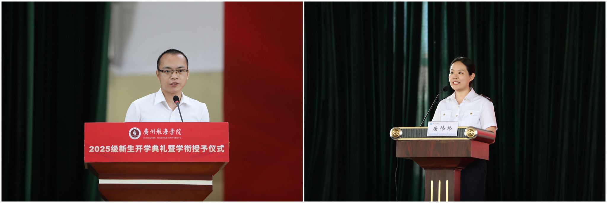 琶洲校区新生代表郭恩彤同学表达了对加入广航大家庭的喜悦与荣幸。她鼓励同学们跳出“高中思维”,勇于在大学这片“人生旷野”上大胆尝试、不怕失败,在多元体验中寻找属于自己的成长路径。