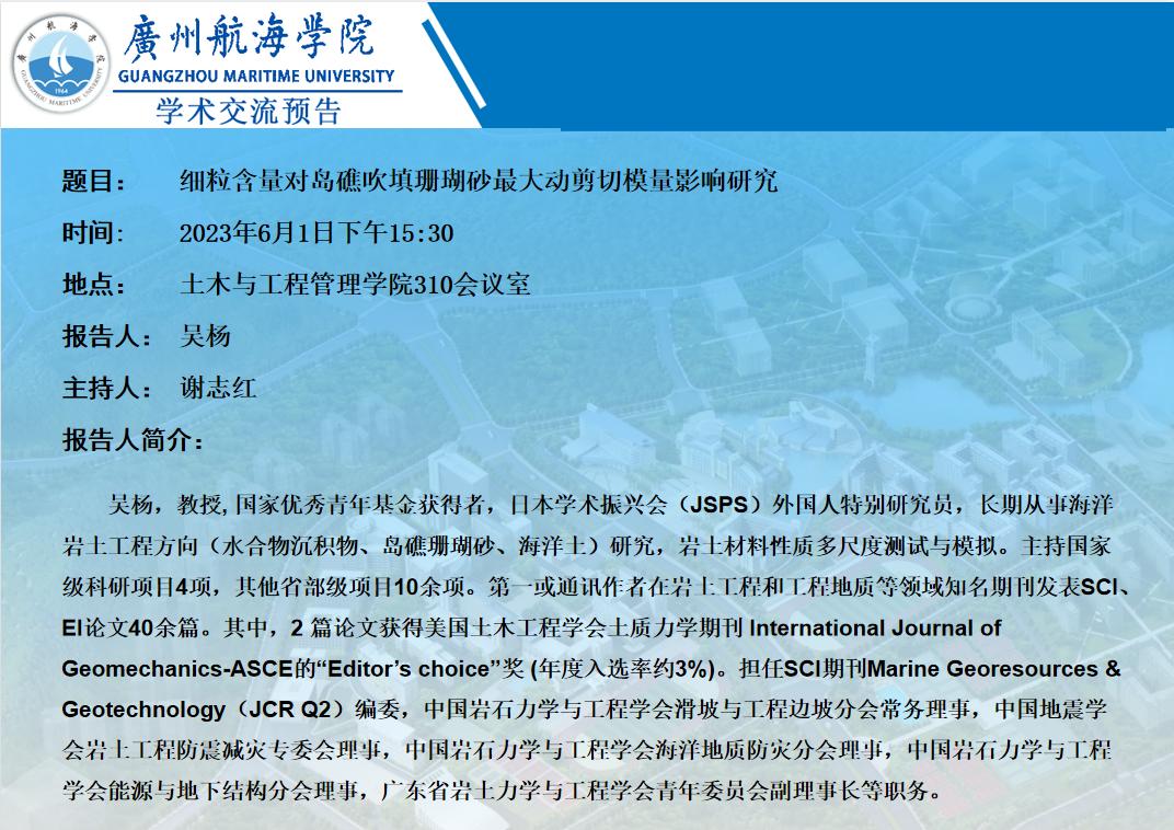 吴杨教授学术讲座预告——细粒含量对岛礁吹填珊瑚砂最大动剪切模量影响研究-欧美精品日韩二区三区_欧美精品亚洲精品日韩专区_欧美日韩人妻精品系列一区二区三区_91在线无码精品秘 入口91_日韩人妻无码精品无码中文字幕_精品少妇人妻av无码久久_精品人妻无码一区二区色欲AⅤ_精品久久久久久人妻无码中文字幕_91人妻人人澡人人爽人人精品_久久午夜无码鲁丝片午夜精品_精品久久久久久人妻无码中文字幕