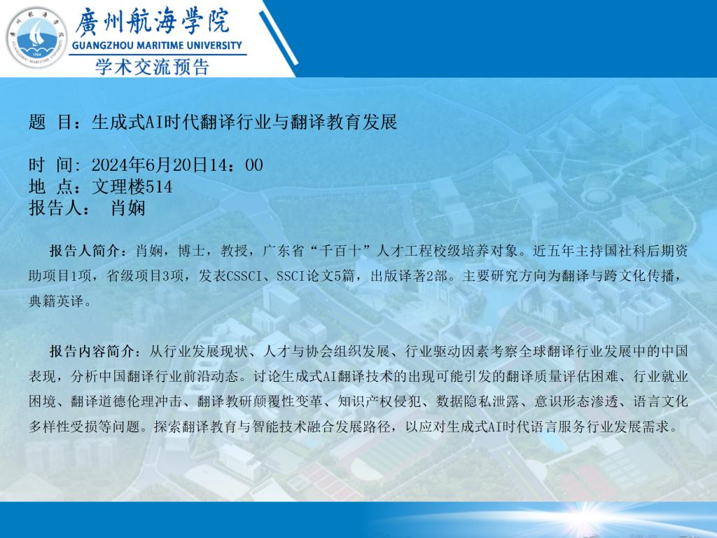 “逐梦深蓝”学术讲座预告:肖娴《生成式AI时代翻译行业与翻译教育发展》