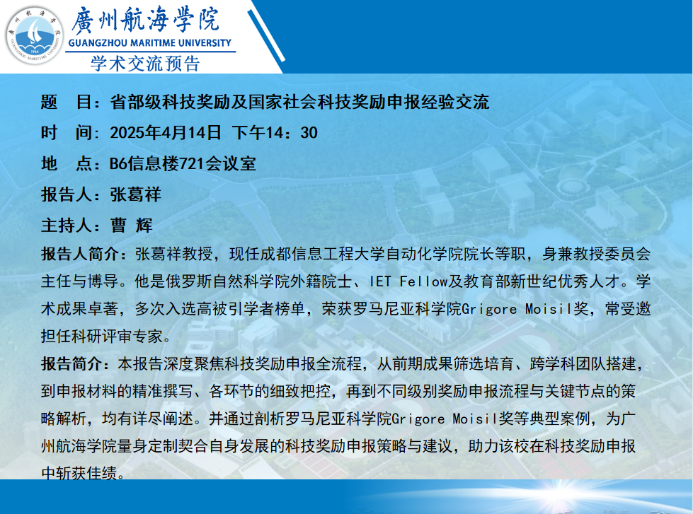 学术讲座预告:张葛祥《省部级科技奖励及国家社会科技奖励申报经验交流》